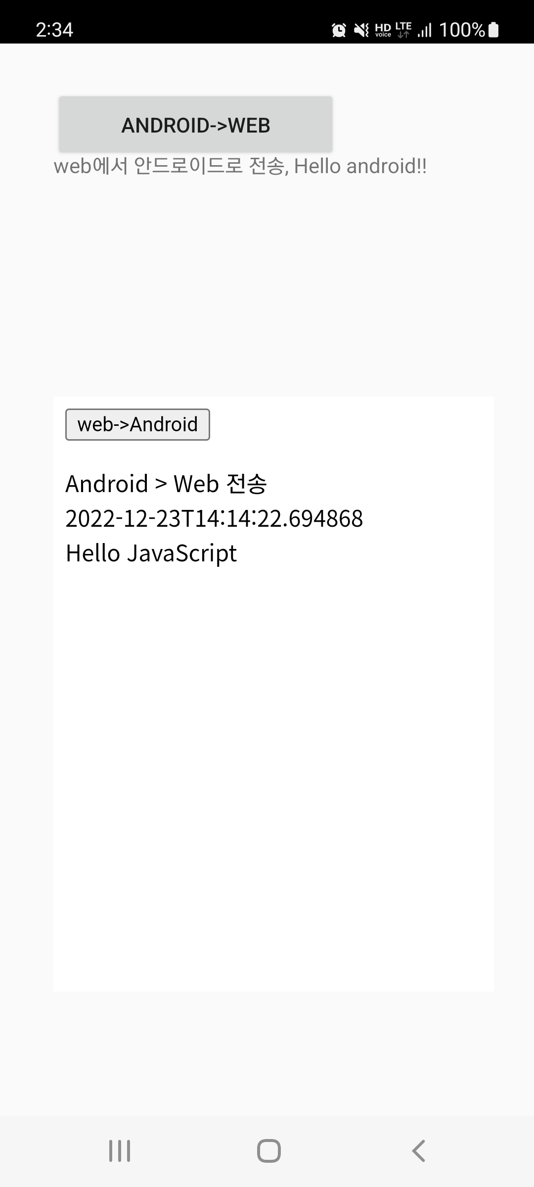 myWebView.loadUrl("javascript:androidToWeb('Android > Web 전송<br>"+time+"<br>Hello JavaScript')");