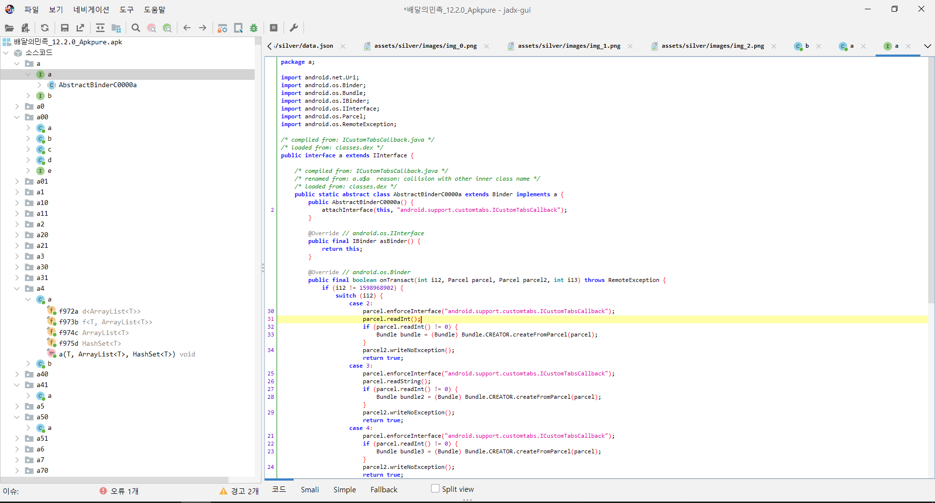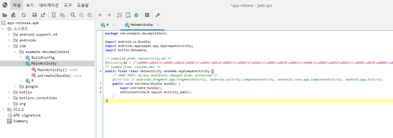 apk 파일을 java 코드로 보려면 .dex 파일을 dex2jar를 사용하여 .jar 파일로 디컴파일한 후 .jar(.class 파일들의 모음) 파일을 .java 파일로 바꾸는 과정이 필요합니다. 하지만 jd-gui를 사용하면 간편히 디컴파일 할 수 있습니다.